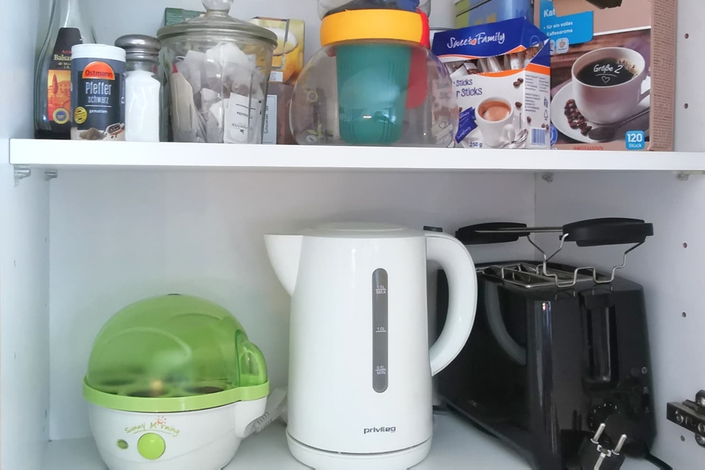 - Küche mit Esstisch und praktisch ausgestatteter Küchenzeile (Geschirrspüler, Mikrowelle, Toaster, Eierkocher, Herd mit 2 Kochfeldern, Kühlschrank mit Gefrierfach) und Radio