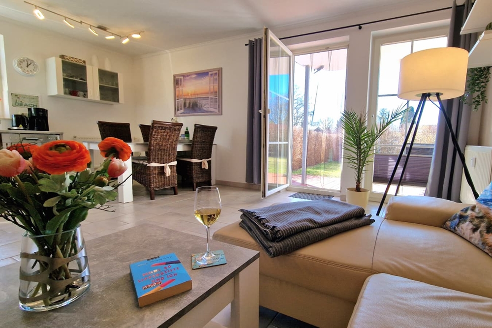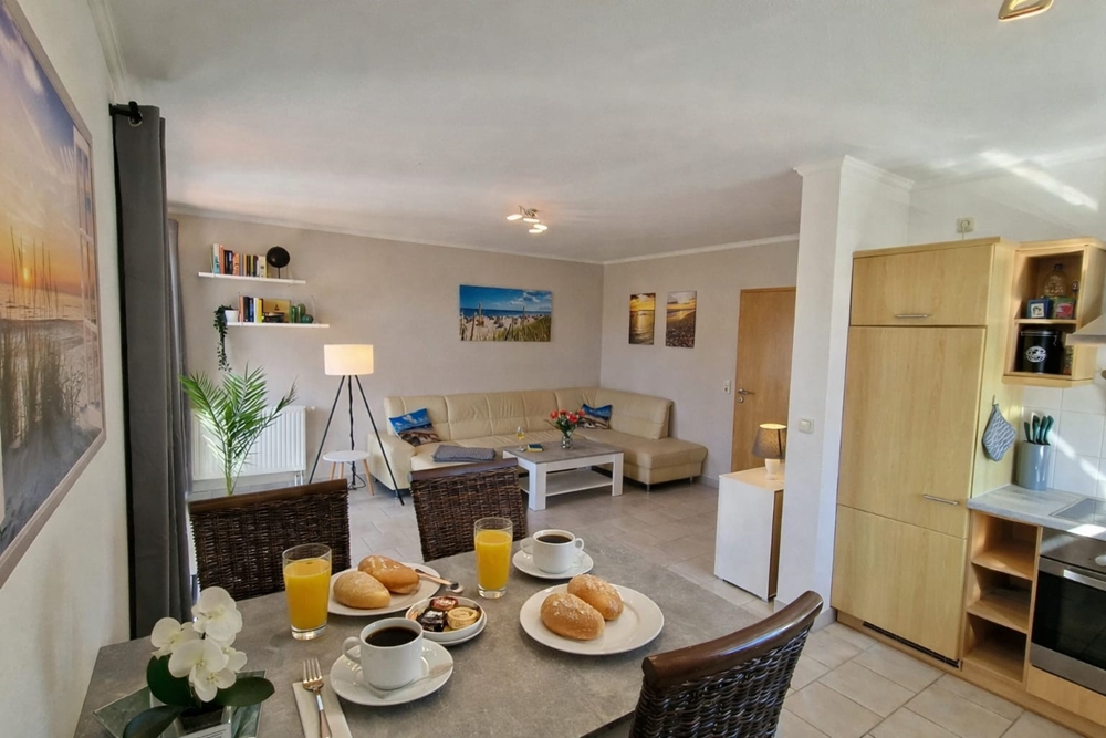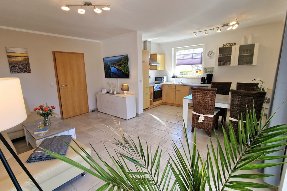 - Großzügiges Wohnzimmer mit ausziehbarer Couch (Schlafplatz 100x200), Smart-TV und angschlossener voll ausgestatteter offener Küche mit Esstisch für 4 Perosnen